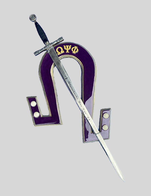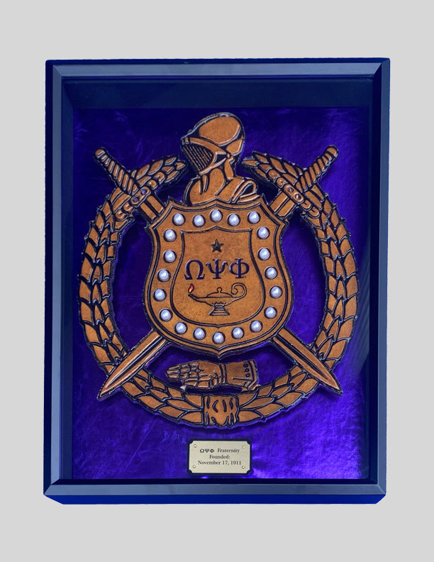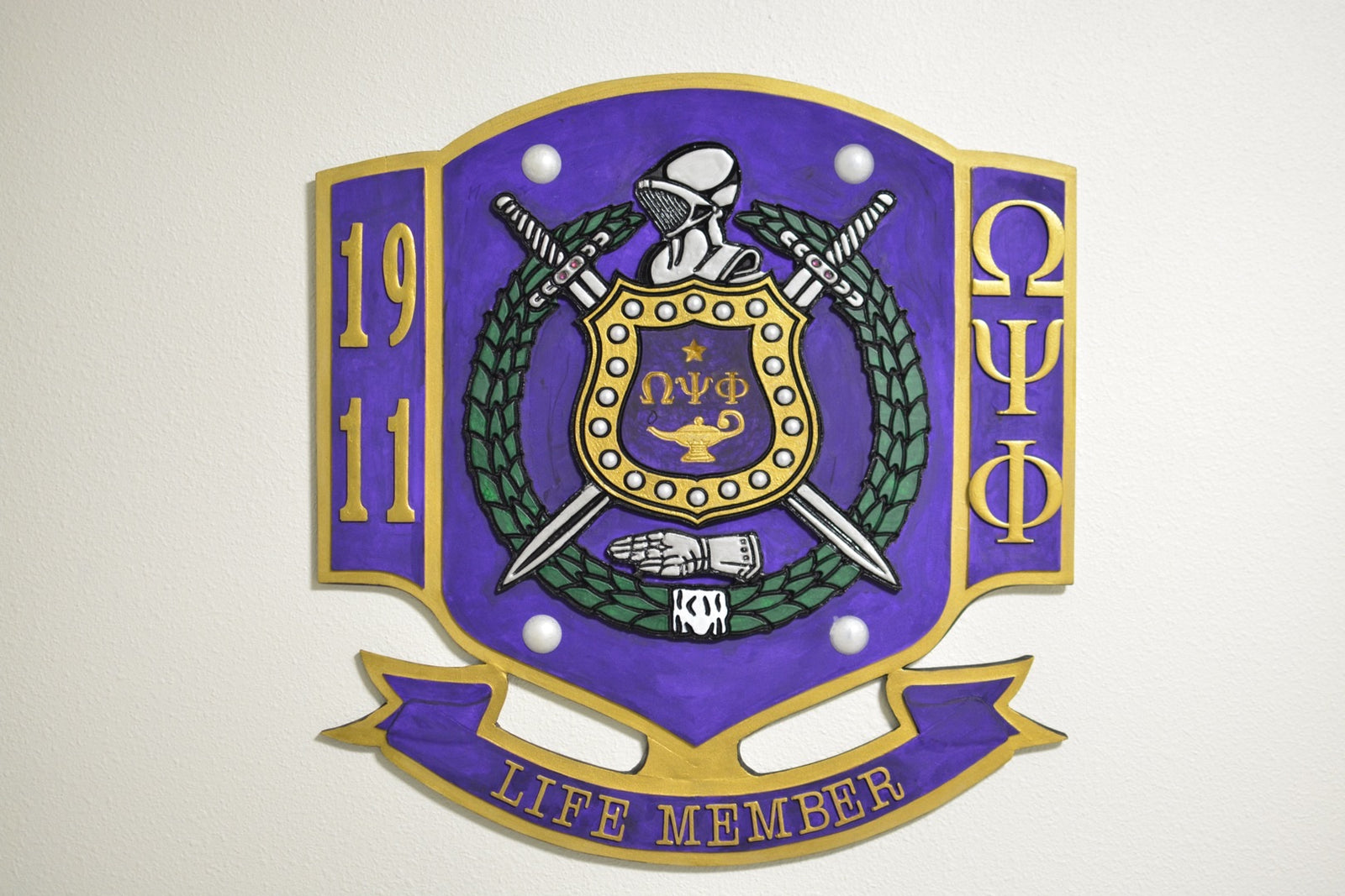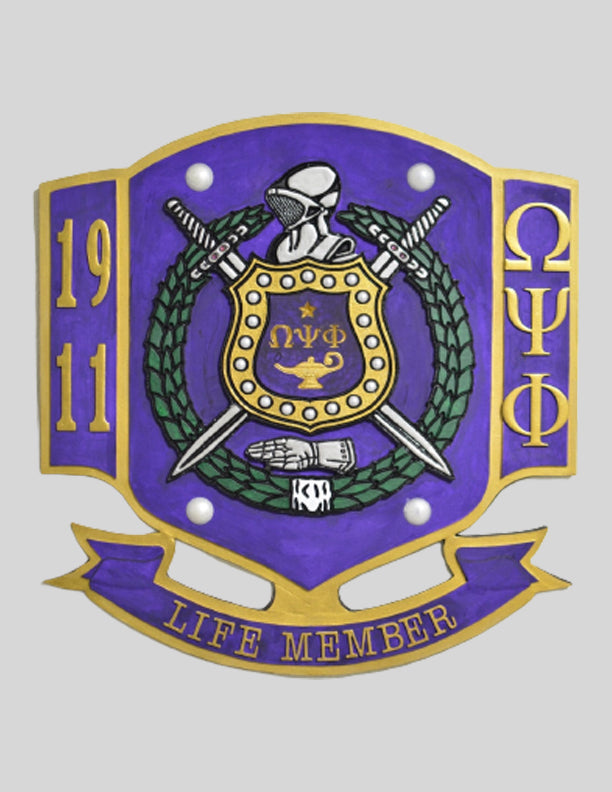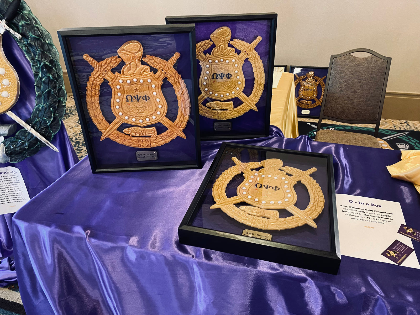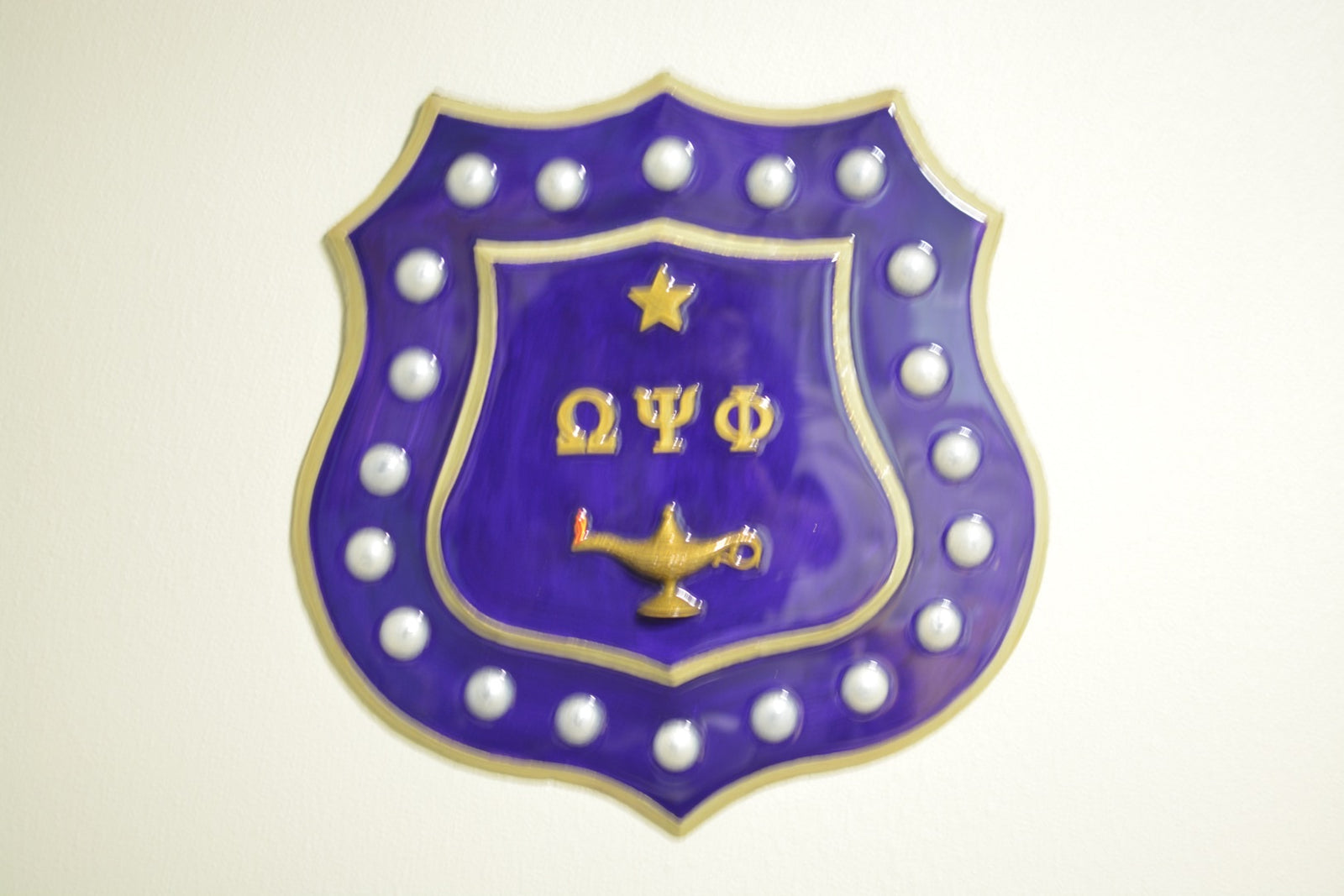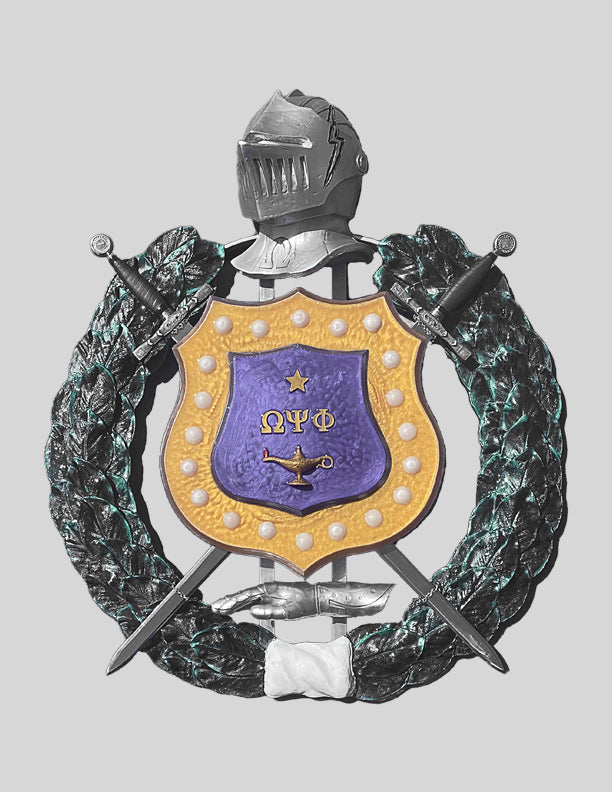 The “SHIELD” taken from the iconic Omega Psi Phi’s Escutcheon displaying the fraternity's colors and pearls.